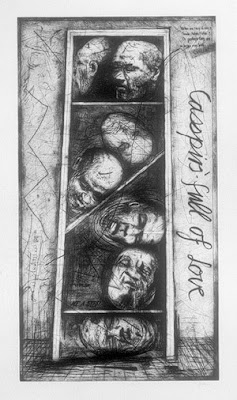 An example of Kentridge’s apartheid-informed art. Casspirs serve as a reference to the military response to anti-apartheid activists; casspirs are armored cars that were used to suppress riots. William Kentridge, Casspirs Full of Love, drypoint, 1989-2000 (image source) |